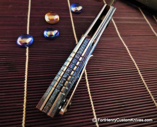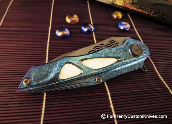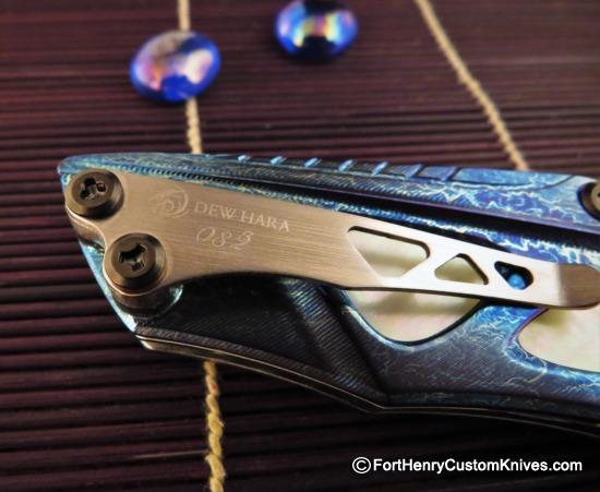 This entire knife has almost too many Special Features to showcase adequately. This is Serial #82 ~ this knife features Dew’s Gorgeous “Energy Storm” Anodizing on the elegantly Contoured Titanium Frame.