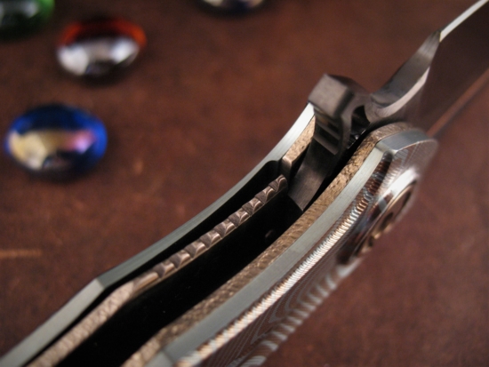 The ergonomics of this knife are wonderful, with Titanium Handles and Stainless Steel Liners that have excellent Texturing and a Matching Waveform Titanium Backspacer.