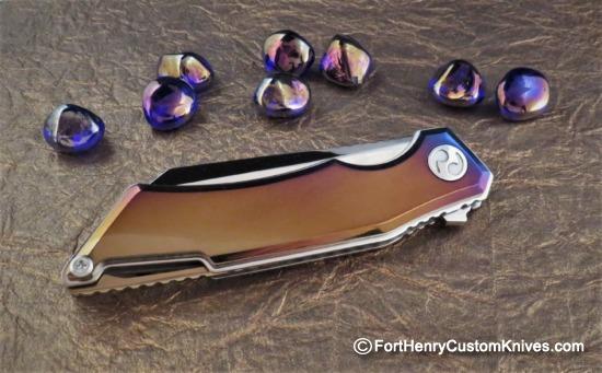 This Dew Hara Ray flipper has almost too many Special Features to showcase adequately. This is a True One of a Kind Flipper with an impeccable Fit and Finish. The Flipping action is extremely smooth due to the Caged Bearings and Excellent Balance of the Blade. The entire Titanium handle on this Dew Hara Ray has a gorgeous “Polished Aurora” finish.