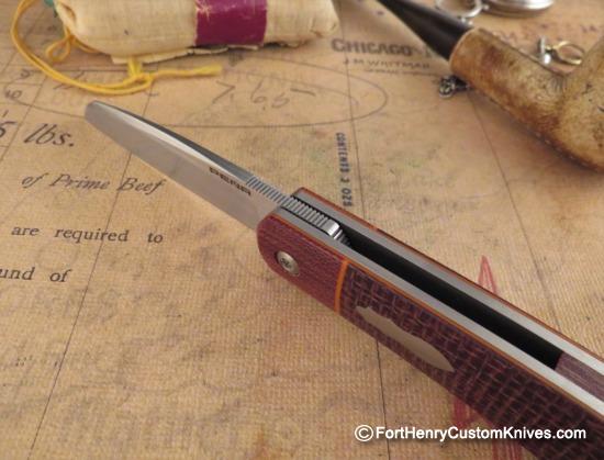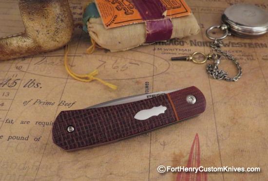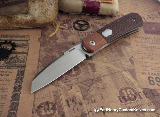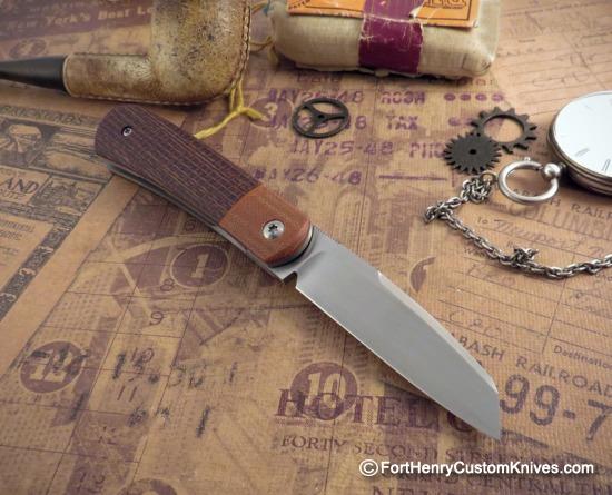 Extremely Solid build, tough enough for any daily cutting ~ sleek enough to be considered a Gentleman’s Flipper but with evident Traditional Elements. This example has Brown Burlap Micarta Scales with Tan Canvas Micarta Bolsters.