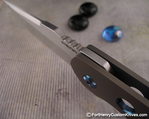 The thick Titanium Frame has a durable Stonewashed & blasted finish.  The Accent holes are Anodized for a unique appearance but they also help to lighten the overall weight. The Blade Flies open effortlessly with just a touch of the Flipper!
