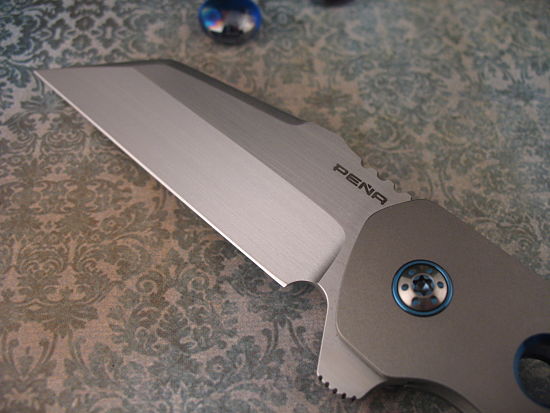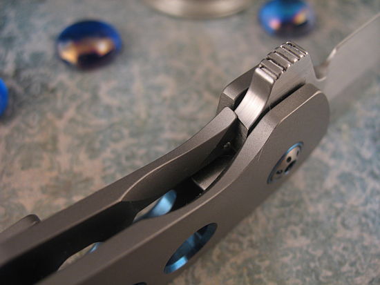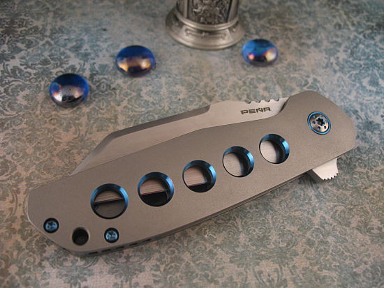 The thick Titanium Frame has a durable Stonewashed & blasted finish. The Accent holes are Anodized for a unique appearance but they also help to lighten the overall weight. The Blade Flies open effortlessly with just a touch of the Flipper!