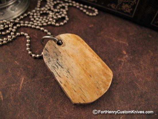 100% Made in the U.S.A – This view shows the rich mellow color and grain of the Mammoth Bone layer that makes the Base of the Tag with the Incredible, and the thicker Mammoth Tooth Top Layer of the Dog Tag.