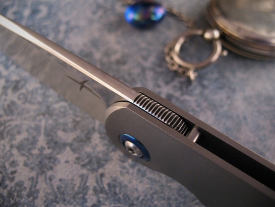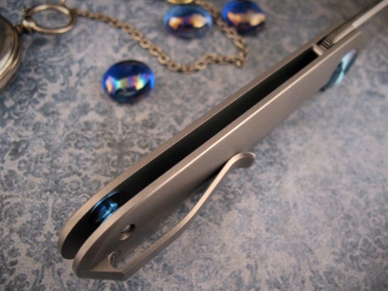The Reverse Oversized Custom Pivot Collar also acts as a Lock Stop Overtravel.  A Screwless, Low Rider Titanium Clip is set for Tip Up Carry ~ this knife will ride Out of Sight.