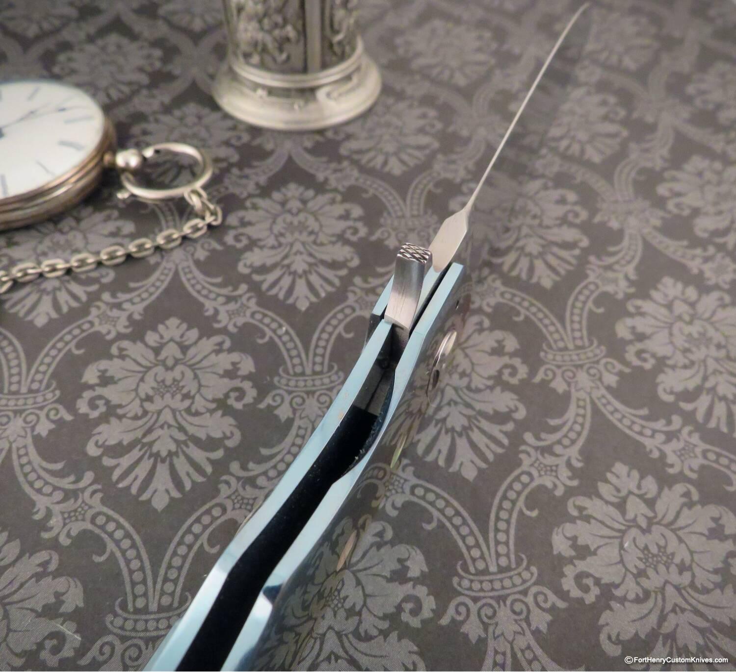 For this knife George chose to Mirror Polish the entire Titanium Frame and this gives the Custom Anodized finish a bright, deep color. But George didn’t stop there, he embellished the handles with beautiful Mother of Pearl Inlays!
