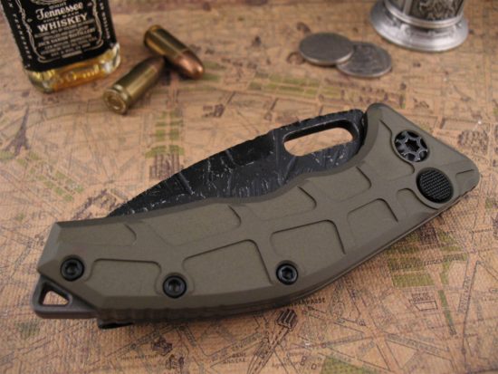 This is the Martyr Automatic by Heretic Knives ~ this particular example has OD Green Scales and a Black textured Blade.