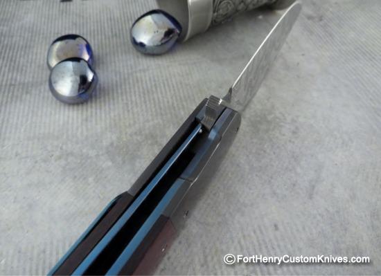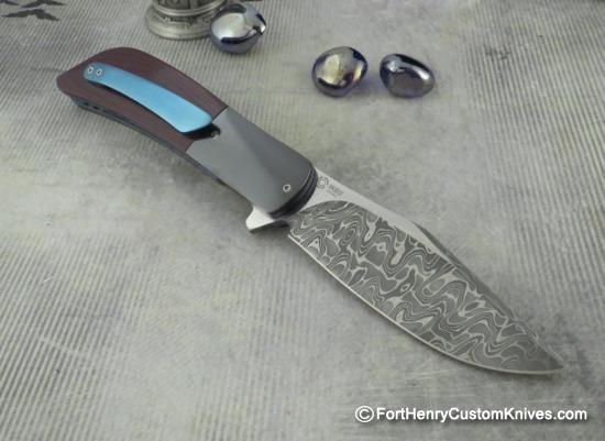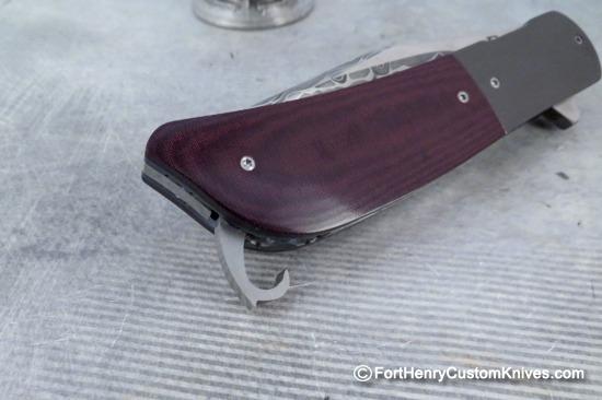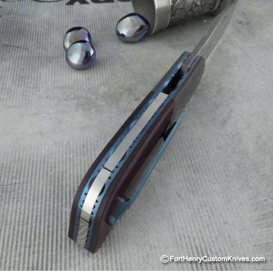 The blade was hand ground from gorgeous Stainless Damascus “Intrepid” Pattern. Herecus has given the blade a unique Two Tone finish. The handle sclaes are Burgundy Linen Micarta and the scales fit with precision against the Mirror Polished Zirconium Bolsters.