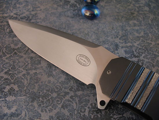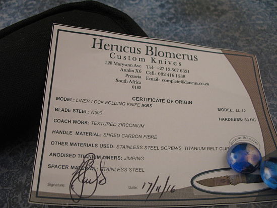 The blade was hand ground from tough N690 Stainless steel which Herucus gave a near Flawless Satin Rubbed finish.   The handle is Shredded Carbon Fiber and it fits with precision against the textured Zirconium bolster onlays.