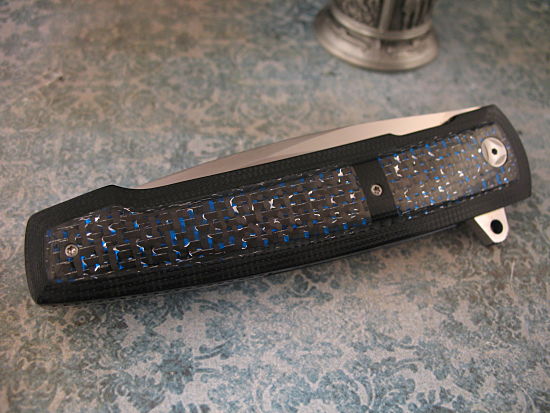 The handle is Black G10 with Lightening Strike Blue/Bronze Inlays.