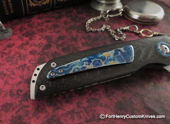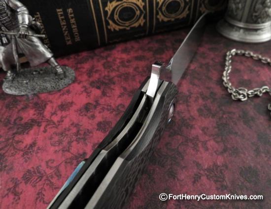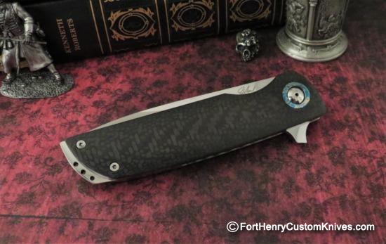 The blade on this Jaco de Kock Kazi was Hand Ground from RWL-34 and it has a Fine Distal Taper and an extremely Labor Intensive Hand Rubbed Finish. Beautiful Custom Timascus Pivot collars are inlayed into the Tight Weave Carbon Fiber handles.