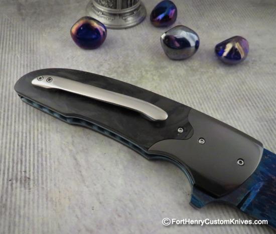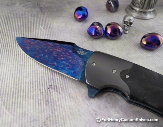 If you are seeking the best in Fit and Finish along with unique design please consider this Jaco de Kock Presentation PL1. This knife has a ton of Upscale Features, starting with the Marbled Carbon Fiber handles which are precision fit against the Polished Zirconium Bolsters, then finishing up with the Amazing Blued “Astroid” Damascus Blade.