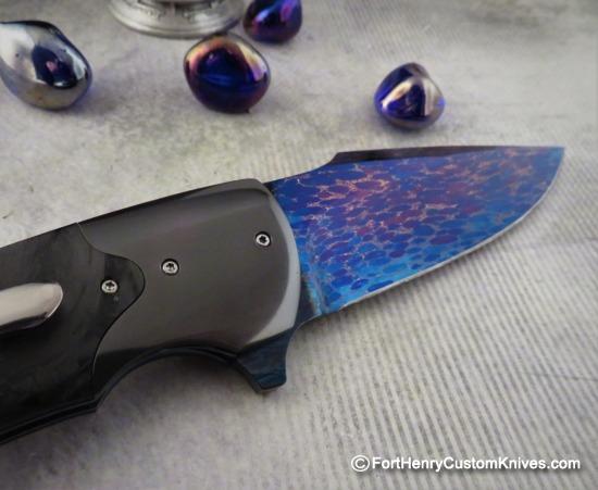 If you are seeking the best in Fit and Finish along with unique design please consider this Jaco de Kock Presentation PL1. This knife has a ton of Upscale Features, starting with the Marbled Carbon Fiber handles which are precision fit against the Polished Zirconium Bolsters, then finishing up with the Amazing Blued “Astroid” Damascus Blade.