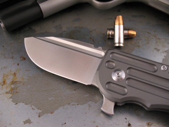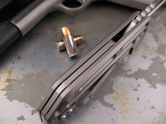 The Custom Thumb Ridges on the Spine along with the excellent ergonomics of the knife make it very comfortable in either the Forward or Reverse position. Full contoured, Sculpted Titanium Frame gives this knife a hefty, confidence-inspiring feeling. A matching Custom Floating Backspacer adds a bit of flare.