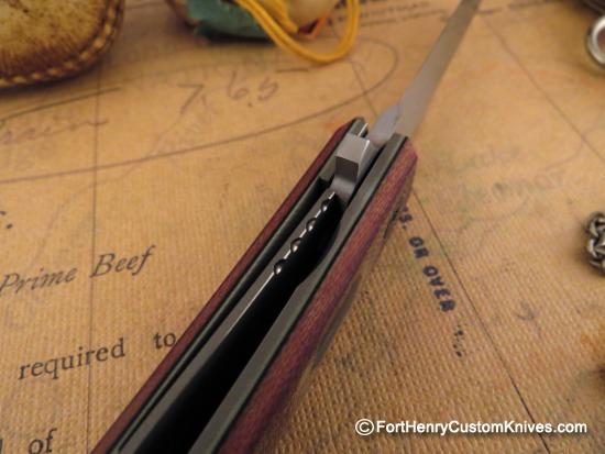 The Blade has a Labor Intensive Hand Rubbed Satin Finish and a very High Hollow Grind with Custom Swedge and Tanto Tip. The Blade Flies open effortlessly with just a touch of the Front Flipper! Note Jared also added a Custom Vintage Patina to the Pivot to blend with the Vintage appearance.