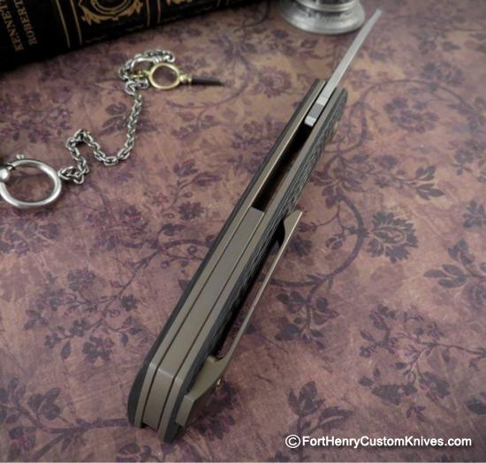 The M390 Blade on this Limited Ediction Jared Oeser F22 has a Mid Height Grind with a Subtle Swedge and a Two Tone Satin Finish.