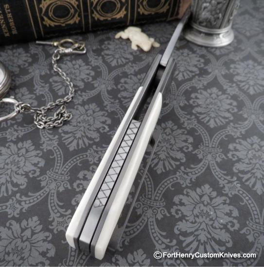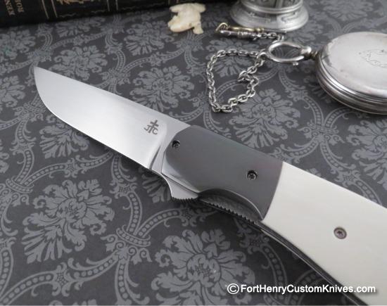 This knife has polished “Super Tusk” handles with polished Zirconium bolsters and Clip. The Bolsters have a hint of Heat Coloring and the Drop Point Blade was Hand Ground from XHP and given a beautiful Hand Rubbed Satin Finish!
