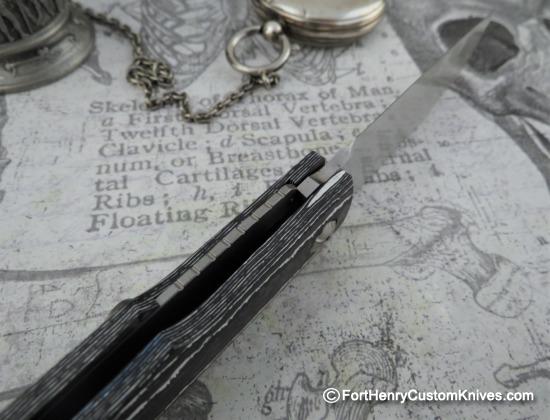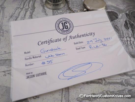 This Jason Guthrie Gunstock has a Superb Full Height Flat ground Blade that has an Impeccable, Labor Intensive Hand Rubbed Finish. Jason takes great care with the Heat Treatment of all his blades, using a Vacuum Heat Treat with Sub Zero Quench.  The Blade has a Silky Smooth action and the knife intuitively falls into your grip when open.