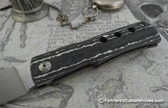 This Lightweight knife has White Storm “Fat Carbon” Carbon Fiber scales that help reduce the overall weight.