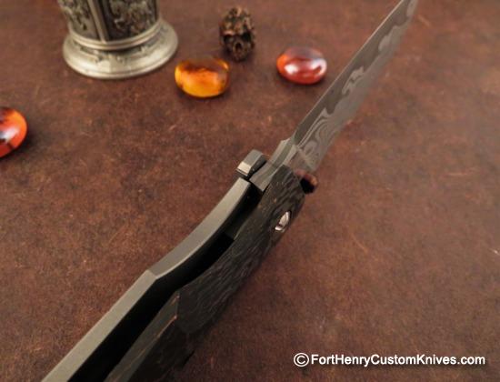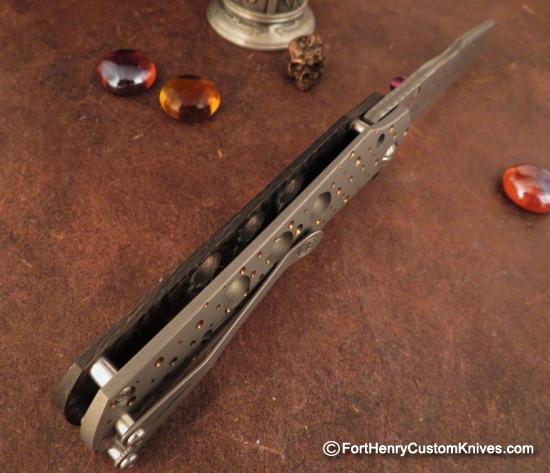 This lightweight knife has a Ventilated “Copper Snake Skin” Carbon Fiber front scale that helps reduce the overall weight. The Blade has a Silky Smooth action and the knife intuitively falls into your grip when open.