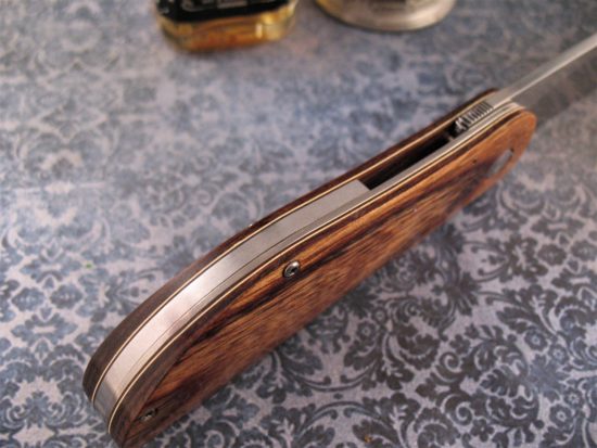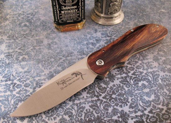 The blade opens very smoothly and I have personally seen JD open this type of blade one handed as quickly as any Automatic! The unique handle material is a special Diamond Wood .