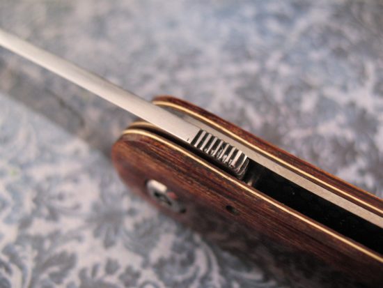 The laws of knife carry in South Africa are very strict, not allowing for any mechanism whatsoever to be used to “assist” the blade open, not a hole, not a stud, not a disk. So the Knife Makers from that country have used their ingenuity to create a unique way of creating a Liner Lock that can be opened one handed.