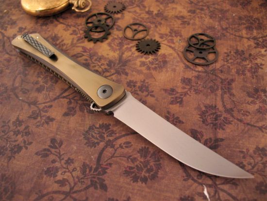 The lightweight Titanium Frame has been Anodized a Deep Gold / Bronze color. The Blade has a Silky Smooth and very Fast action and the knife intuitively falls into your grip when open.