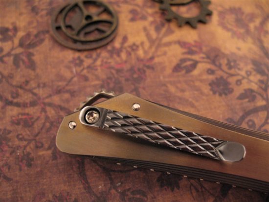 The lightweight Titanium Frame has been Anodized a Deep Gold / Bronze color. The Blade has a Silky Smooth and very Fast action and the knife intuitively falls into your grip when open.