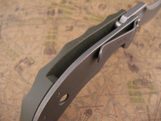 The Titanium Frame and clip have a deep Stonewashed finish for Max durability. The knife rides very discreetly due to the Flat Ti Scale and the Deep carry pocket clip.