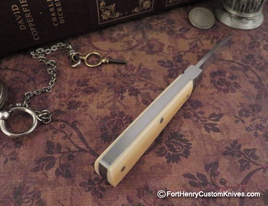 Extremely Solid build yet it absolutely radiates Precision! The CPM 154 Blade has superb “Walk and Talk” and the Half Stop is very secure. The Blade has a Labor Intensive Hand Rubbed Satin Finish and a very High hollow Grind with a Custom Swedge.