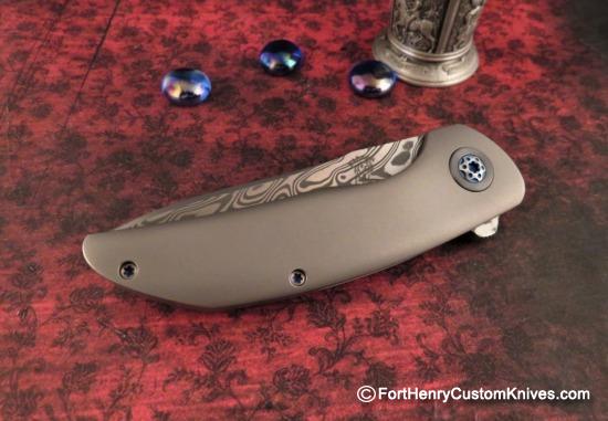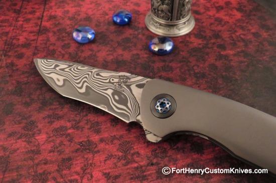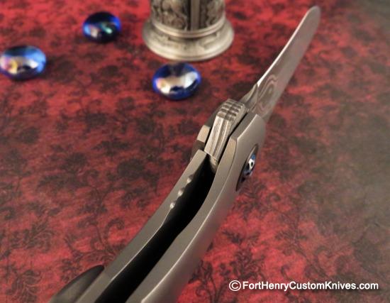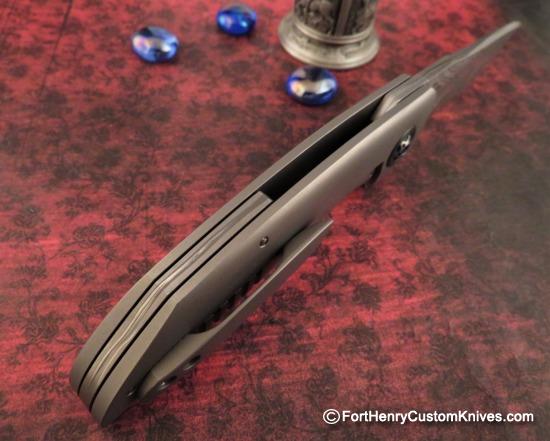 The Blade flips open Extremely smoothly (no wrist action necessary). This example has a Two Tone Anodized Titanium Pivot with with Custom Zirconium pivot collars.