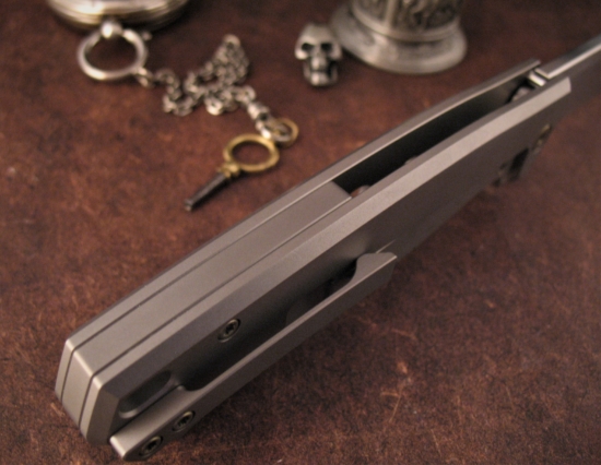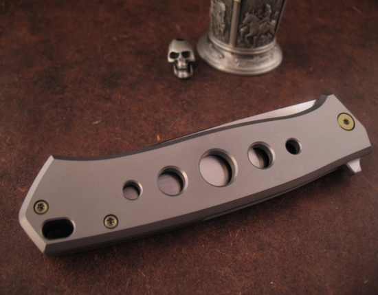 The sleek profile when open reminds one of a fine sportscar. The Contoured Titanium Frame has been given a unique slightly textured finish. Kamil used All Titanium Hardware and gave it a Polished Gold Anodized finish.