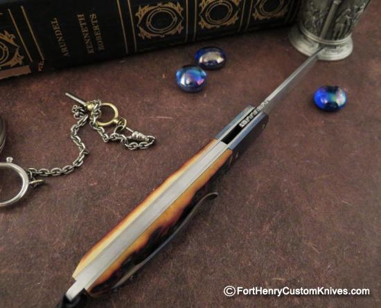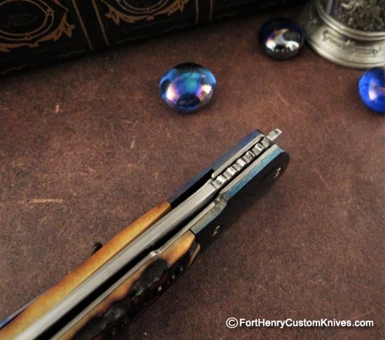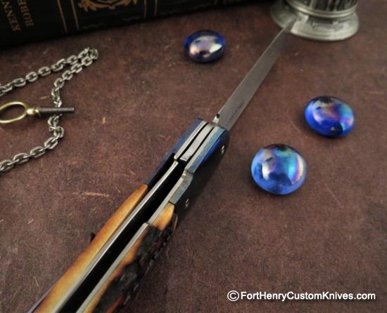 The Spear Point Blade has a Labor Intensive Hand Rubbed Finish. The Blade Flips open effortlessly, the lock engages with a gentle sound and there is absolutely no play anywhere in the knife.