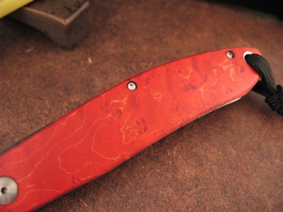 The Polished Titanium Frame and Standoffs give this knife a Sturdy yet Lightweight feel. When opened, the extended Tang used to open the Blade rests inside the handle.