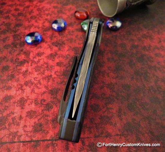 This Larevo Gryphon also has Beautiful Anodized Titanium liners. The San Mai Blade has a beautiful High Contrast pattern and the Blade leaps out of the frame with just a touch of the Flipper. Perfectly Centered when closed.