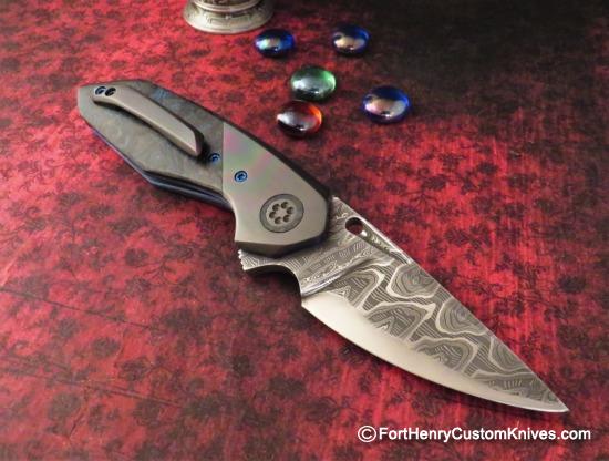 A bold knife with Amazing Custom Materials. The handle Scales on this one are Thick, Fat Carbon“Blue Matter” Carbon Fiber which match up beautifully with the Satin and Heat Colored Zirconium Bolster. The Precision Fit is so tight, you cannot even feel the seam! The Action from the Subtle Flipper Mechanism is Super Fast, due to the Skiff “Dual Row Bearing System” and the excellent balance of the blade.