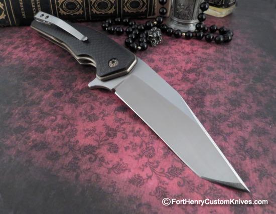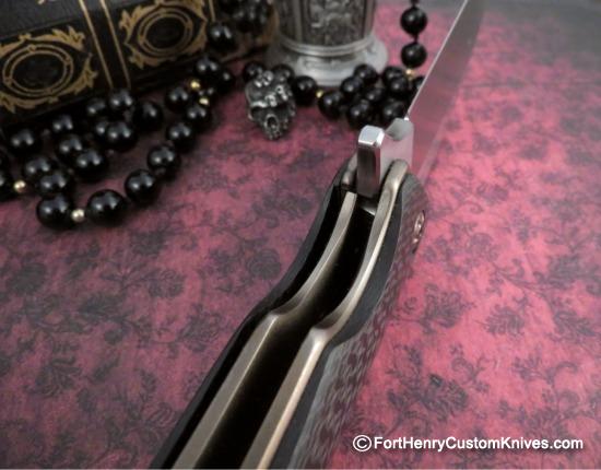 The Scales are Carbon Fiber over a beautiful Bronze Anodized Full Titanium Frame. The blade has a very unique Tanto Grind with a Finessed Penetrator Tip, this sets it apart from all other of Les’ designs.