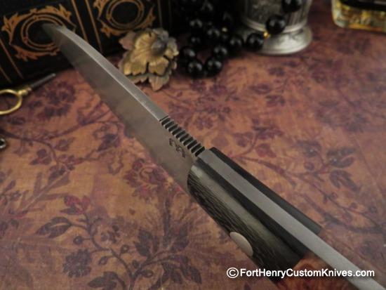 The Forged 1095 Blade has a Beautiful Hamon and a Full Height Flat Grind with a Razor Sharp Edge. The Full Length Hamon on the Blade is a Visible Representation of the Traditional Clay Tempering process ~ Mario learned this Technique from his friend Claudio.