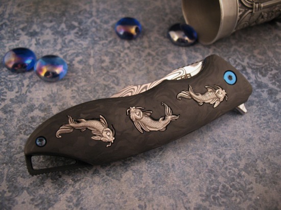 Here is a chance to own a Unique Customized S7 design by Michael Zieba – this is a Discreet Tactical Flipper with beautiful .995 Silver Koi inlays and Custom Koi Engraving.