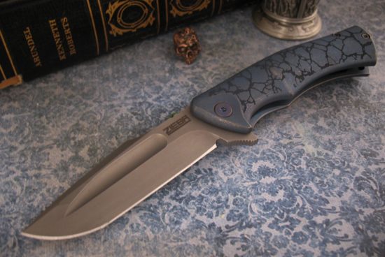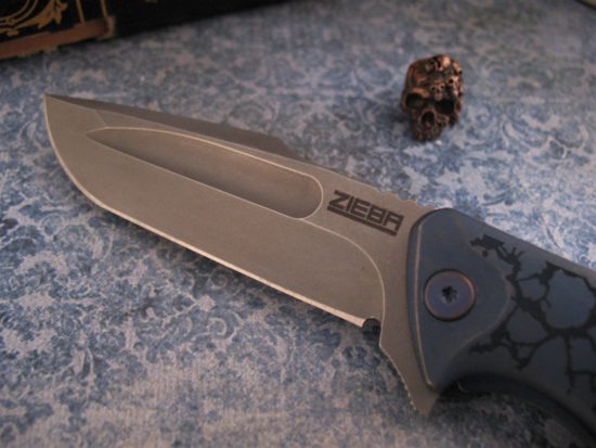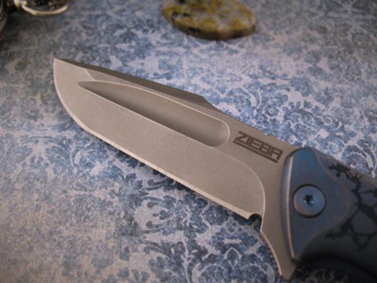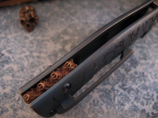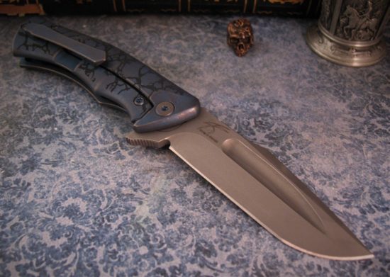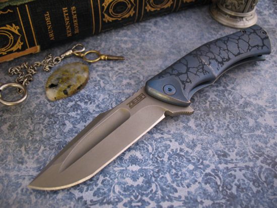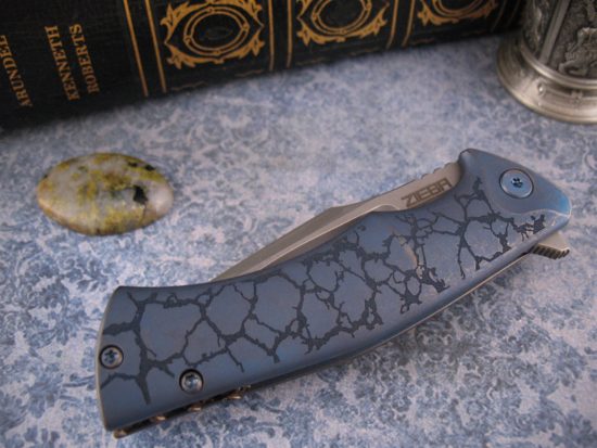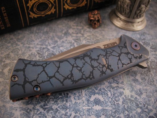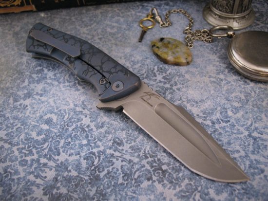 Michael gave this Mini a Rounded Ti Scale which he also Anodized a Denim Blue then he used his new laser to etch a Cracked Earth pattern on the handle. All Hardware is Titanium with Custom Anodizing.