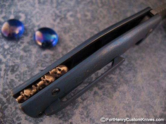 Michael gave this Mini a Rounded Ti Scale which he also anodized a Denim Blue then he used his new laser to etch Concentric Circles on the handle. All Hardware is Titanium with Custom Anodizing.