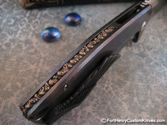 The knife has a Near Full Length “Momento Mori” Pile of Skulls Cast Bronze Backspacer that adds Strength to the frame and it extends just above the Frame to aid in grip retention.