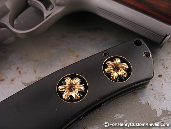 The Recurve S35VN Blade flips effortlessly due to the internal Bearings and Precision balance of the blade – no wrist action needed. Michael gave the Thick Titanium frame an aged appearance which he accomplished using a Proprietary Black Nickel finish.