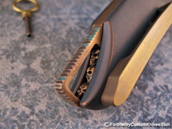 Here is a Pic of the Polished Bronze Skulls Backspacer ~ really blends well with the accent color of the Blue Denim Anodizing