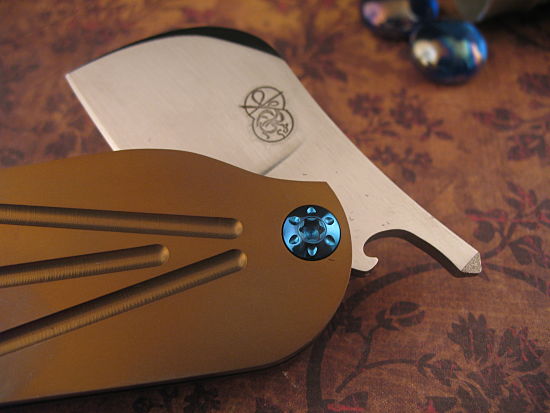 The titanium scales are nicely anodized bronze.  This example features a Thick S35VN Blade.