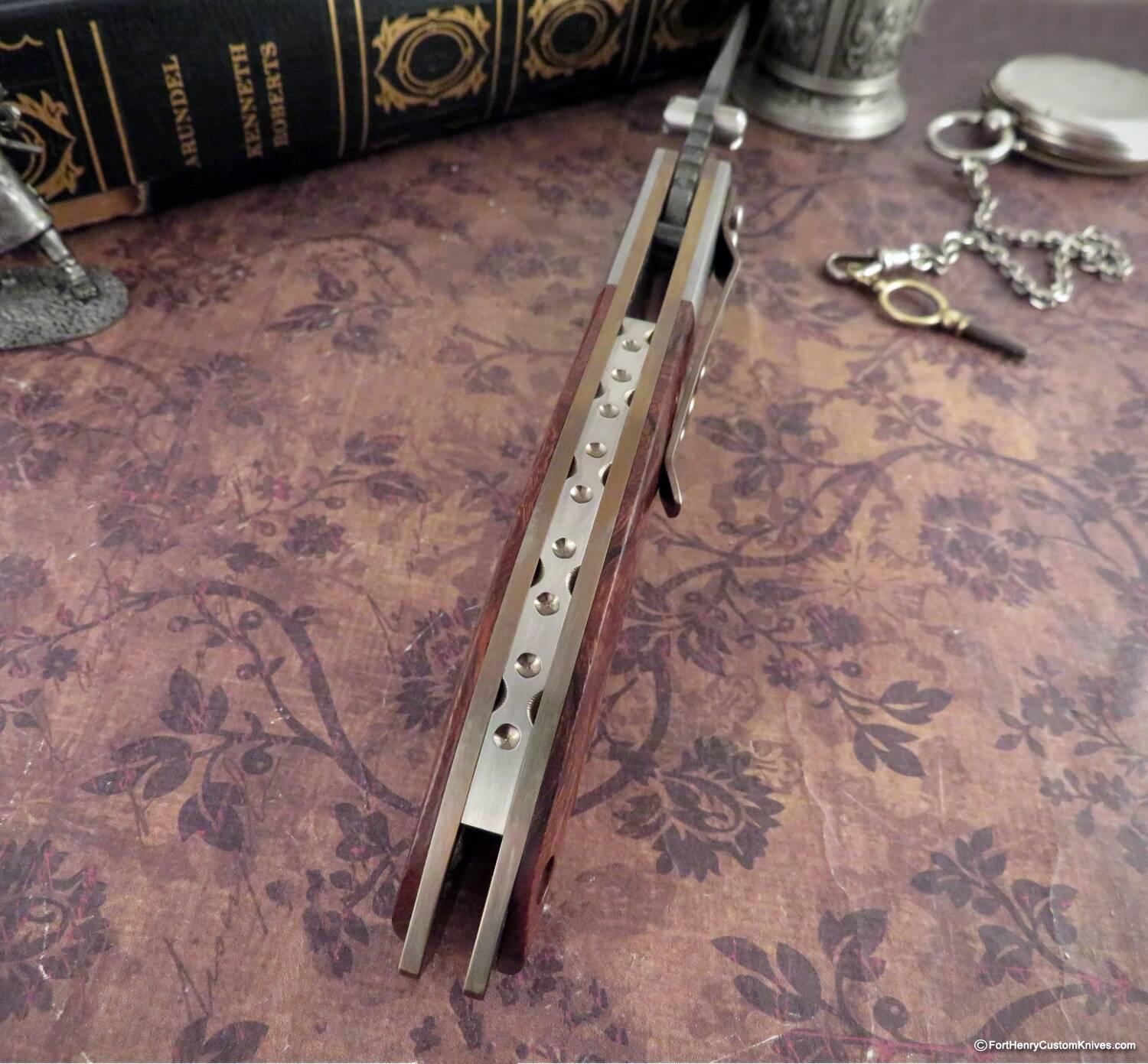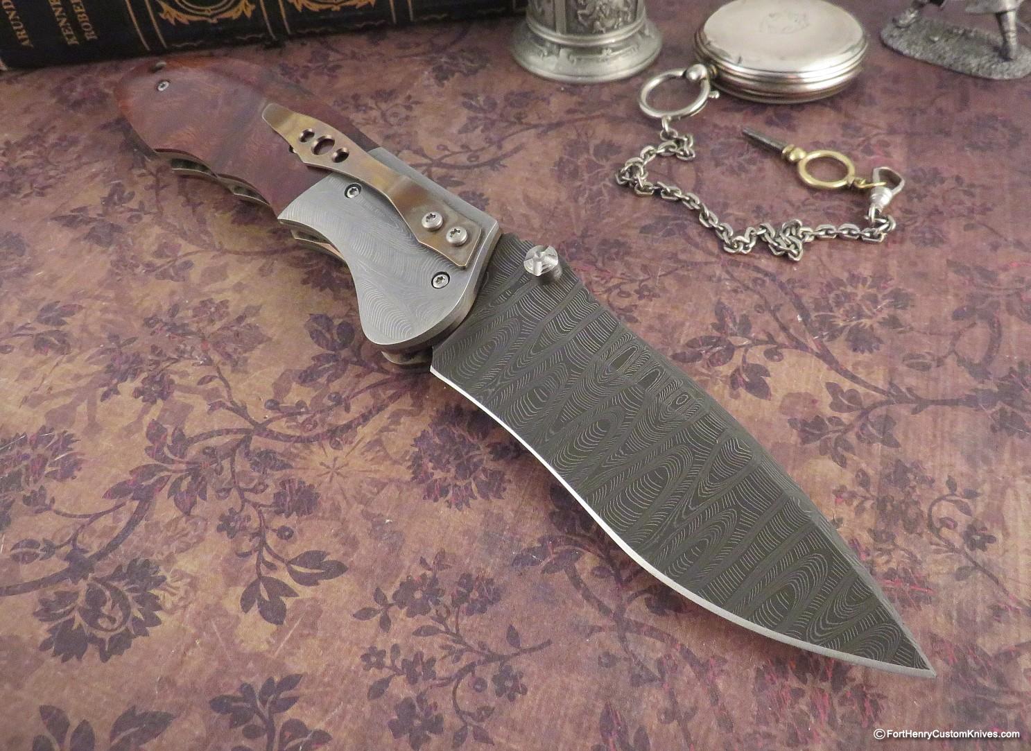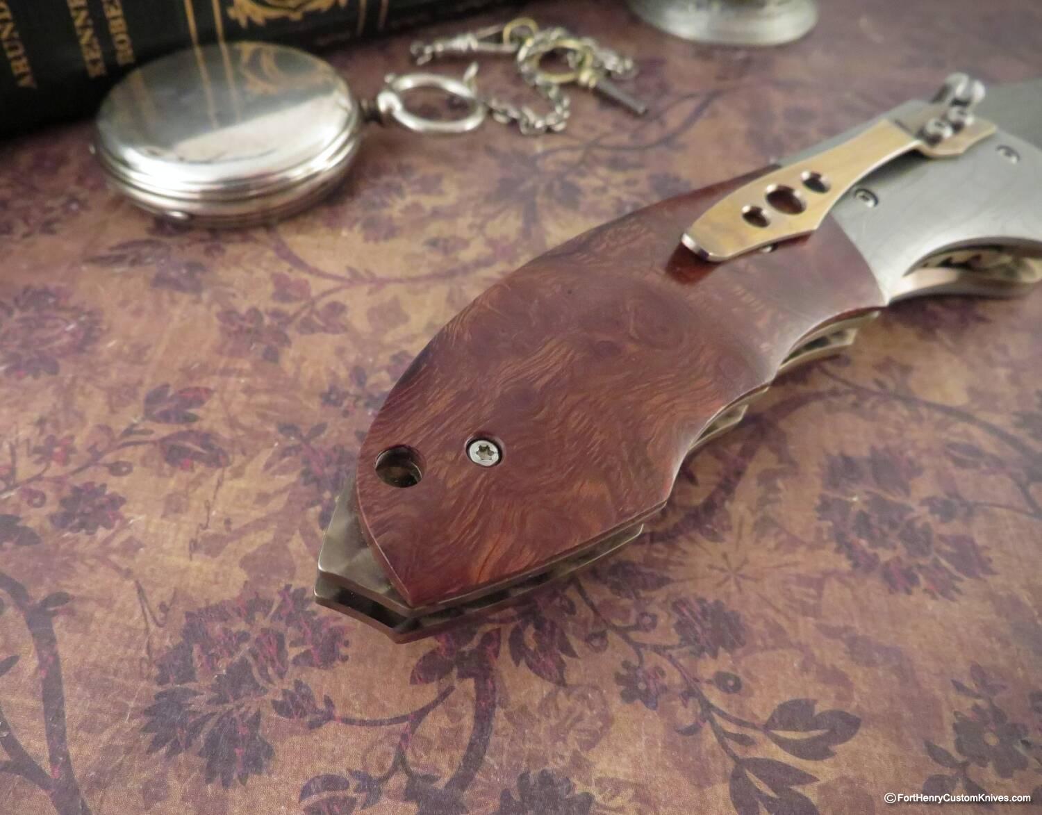 This is a tough full sized Tactical with wonderful ergonomics!   The interior Jeweled Titanium Frame is overlayed with Desert Ironwood scales.  The bolsters are made from Chad Nichols Stainless Damascus and are precision fitted to the Ironwood so well that it appears to be one piece ~ you cannot even feel the joint.