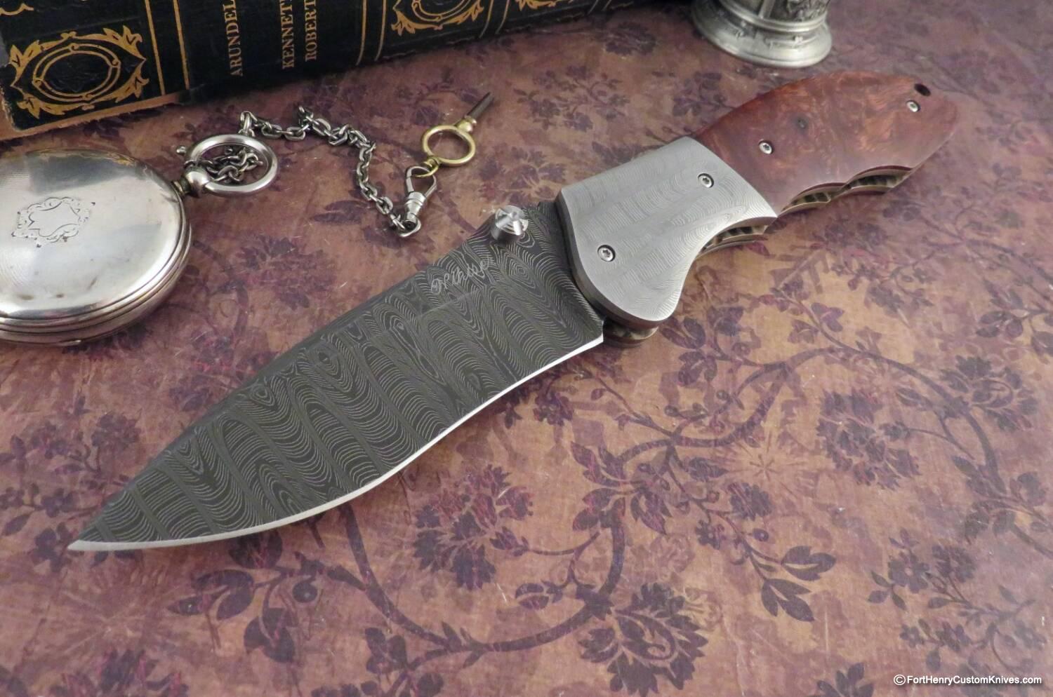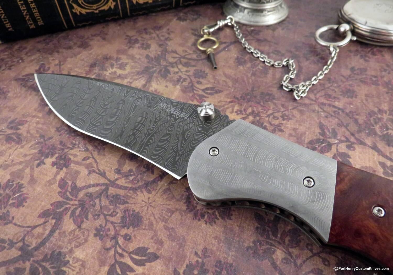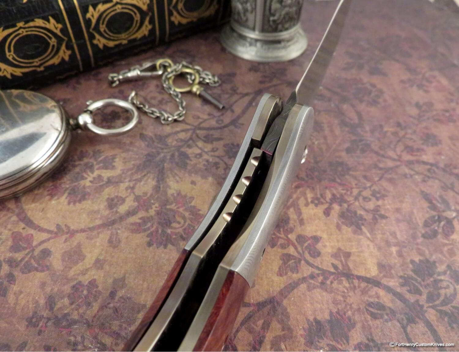 This is a tough full sized Tactical with wonderful ergonomics!   The interior Jeweled Titanium Frame is overlayed with Desert Ironwood scales.  The bolsters are made from Chad Nichols Stainless Damascus and are precision fitted to the Ironwood so well that it appears to be one piece ~ you cannot even feel the joint.