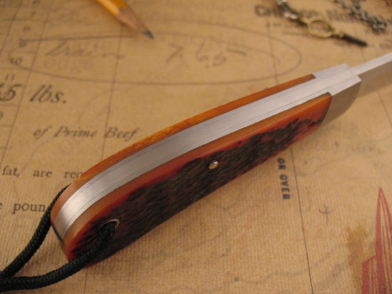 The Blade has a Labor Intensive Hand Rubbed Satin Finish and a very High Hollow Grind with Custom Swedge.