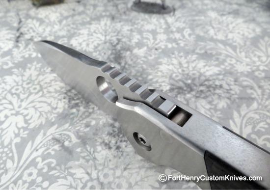 The Peter Rassenti Alpha Integral is an overbuilt precision made knife in a bomb proof package. Extremely thick, One Piece Titanium Frame with custom Carbon Fiber Inlays on each side. The S90V Blade has a labor intensive Hand Rubbed finish, in a Modified Drop Point shape. This design utilizes the Licensed Spyderhole for ambidextrous opening.