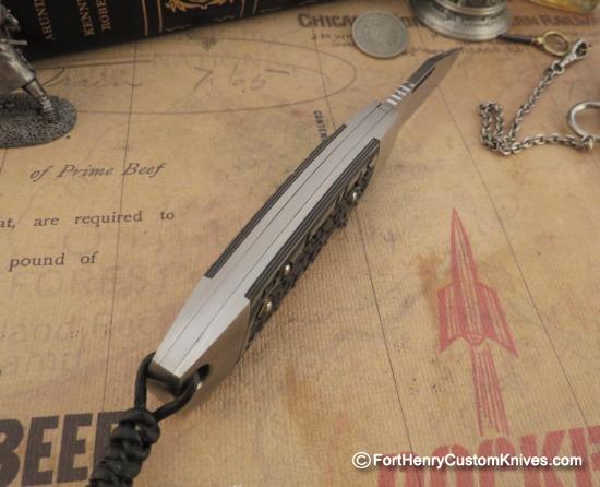 The Hand Ground Blade has a Labor Intensive Hand Rubbed Finish and a Convex Edge. Smooth action with just the right amount of tension on the Spring for a firm snap when closing. Riaan has also added a Satin Finished Stainless Steel Arrow Shield in the handle.