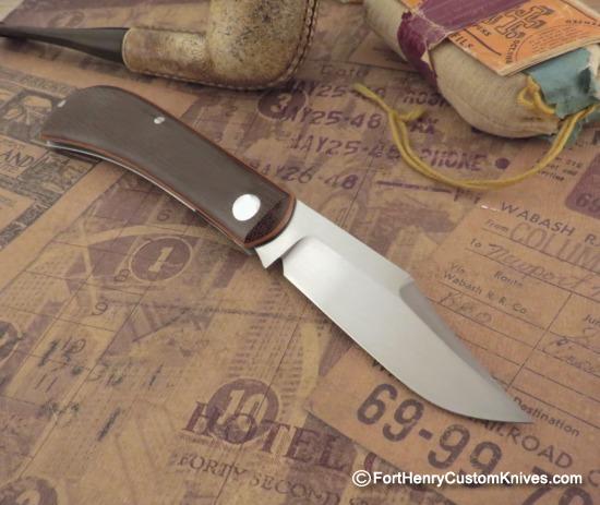 This Lanny’s Clip design is a bit on the large side ~ it has an Extremely Solid build, tough enough for any Daily Utility or small Game cutting chore.  The Hand Ground Blade has superb “Walk and Talk” with a Half Stop that is very secure.